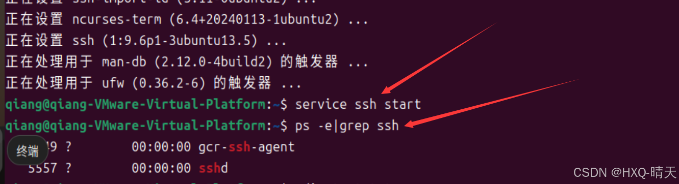 输入 以下代码启动ssh服务,然后输入第二行代码,若出现下列现象说明ssh服务已经正常启动