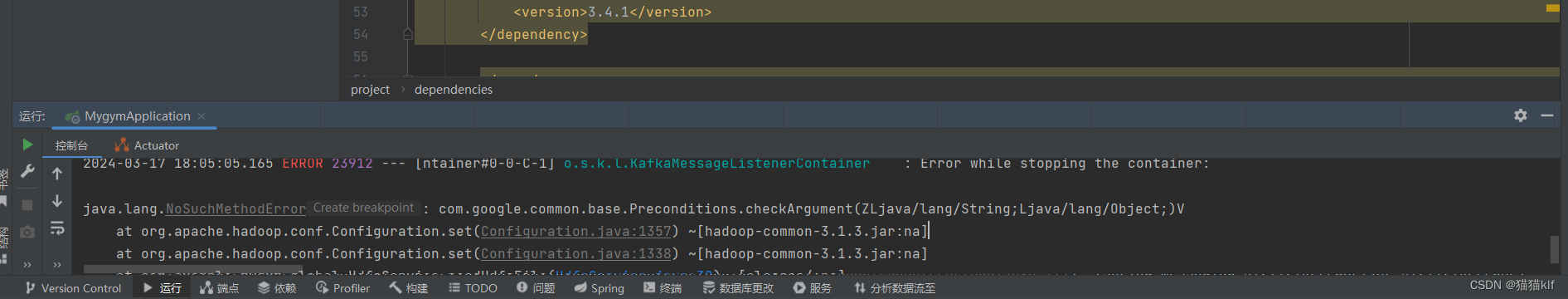 Apache Hadoop 使用 Guava 库(之前叫做 Google Collections),Guava 库中的 Preconditions 类提供了各种前置条件检查的方法。NoSuchMethodError 表明项目中包含的 Guava 库版本与 Hadoop 预期的版本不一致。可能的情况是,项目中包含了一个较旧或较新的 Guava 版本,而这个版本中没有 Configuration.java 文件中调用的那个特定方法签名。