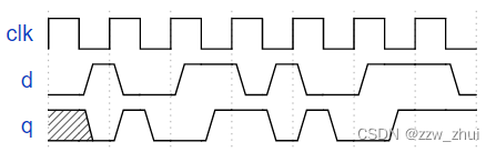 D触发器由逻辑综合器在使用时序always块时创建。D触发器是“组合逻辑块后跟触发器”的最简单形式,其中组合逻辑部分只是一个wire信号。