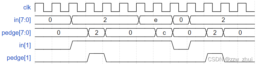 上升沿检测,采用一个D触发器即d_last来存储上一个时钟周期的输入,d_last、in对应位分别为0、1时,则检测到上升沿。
