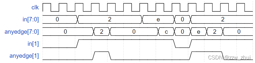 对于 8 位向量中的每一位,检测输入信号何时从一个时钟周期内变为下一个时钟周期内(检测上升沿和下降沿)。输出位应在发生 0 到 1 转换后的周期内置位。