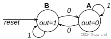 这是一个摩尔状态机,有两种状态,单输入单输出。请实现这个状态机。请注意,复位状态为 B。