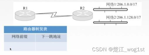 如图所示,如果不使用构成超网,R1路由器的路由表中就得存两个表项,一个是206.1.0.0/17,另一个是206.1.128.0/17,但是我们发现,这两个表项的下一跳地址都是R2路由器,那么我们可以把网络前缀减少1,也就是斜线后面的17变为16,我们就能把这两个不同的网络合成一个网络了,至于这两个网络要如何划分,交给R2路由器就好,如此一来,R1路由器中的路由表就变小了,变小后的那个目的网络地址,子网掩码,下一跳地址如下表所示