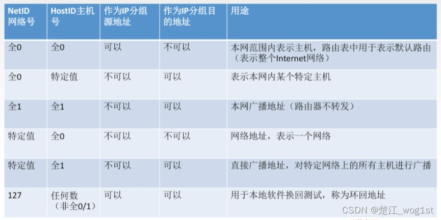 各类IP地址中有些IP地址有特殊用途,不用做主机的IP地址: