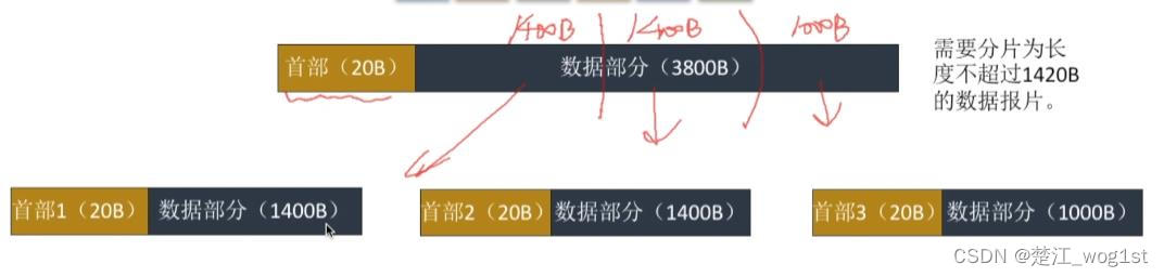 如图所示,我们把数据部分长为3800B的数据报给分片,分成三个小的数据报,大小分别为(1400B,1400B,1000B,首部占了20B,MTU为1420B)