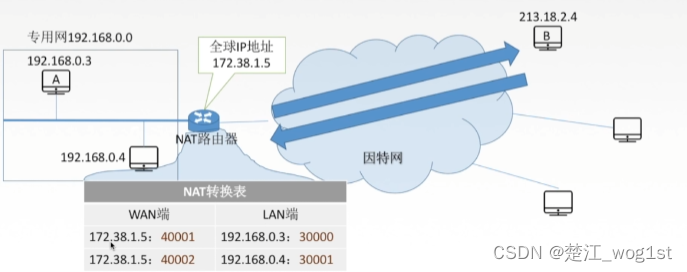 假设左端(LAN端)的IP地址为192.168.0.3(随机端口为30000)的主机向IP地址为213.18.2.4的主机发送信息,NAT路由器收到IP分组后,为该IP分组生成一个新的端口号40001,同时把IP分组的源地址改为172.38.1.5,之后进行转发并把这个映射关系写到NAT转换表内。响应分组到达NAT转换器之后,通过NAT转换表将IP分组的目的地址改成192.168.0.3(端口改为30000),如此一来就完成了局域网内的主机与广域网上的主机的一次通信。