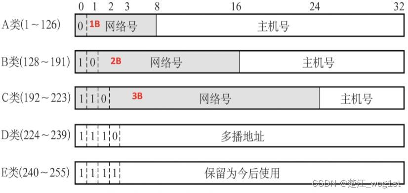 连接到因特网的每台主机或路由器都会分配一个32比特的全球唯一的一个标识符,我们称之为IP地址。早期的IP地址是分类的,分成5类,如图所示