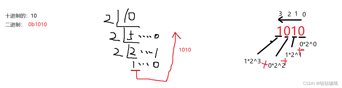 - 二进制:逢二进一,只能显示0,1, 二进制以0b开头,十进制2 ---》 二进制: 0b10 0B10