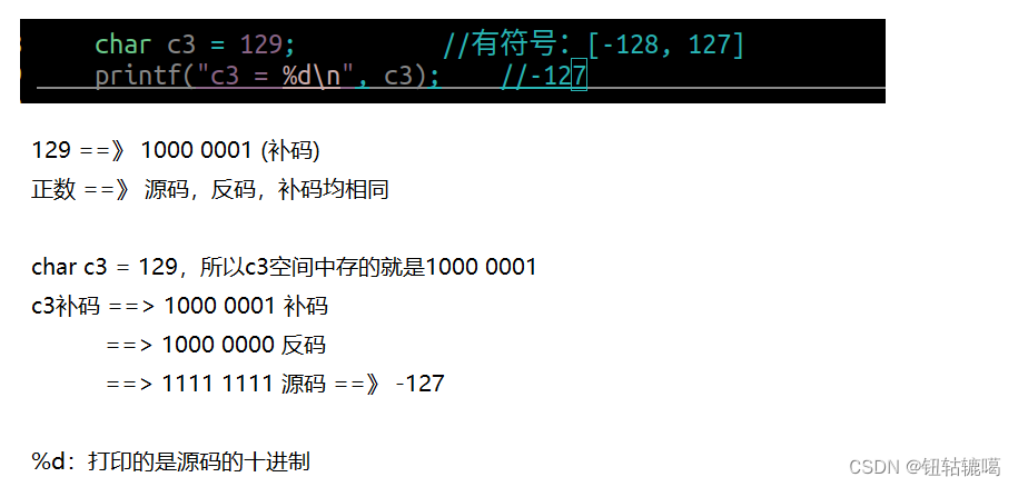 - signed 有符号的,代表该变量中有正负之分的,默认是signed类型 %d