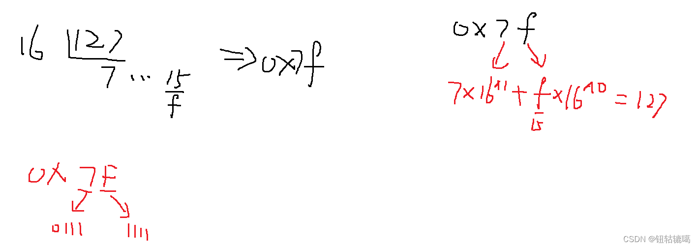 - 十进制转16进制:十进制数循环除以16,取余数,直到结果小于16