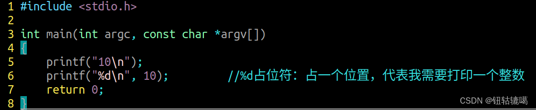 功能:格式化输出; 格式: #include <stdio.h> printf("要输出的内容 占位符 转义字符", 数据1, 数据2);