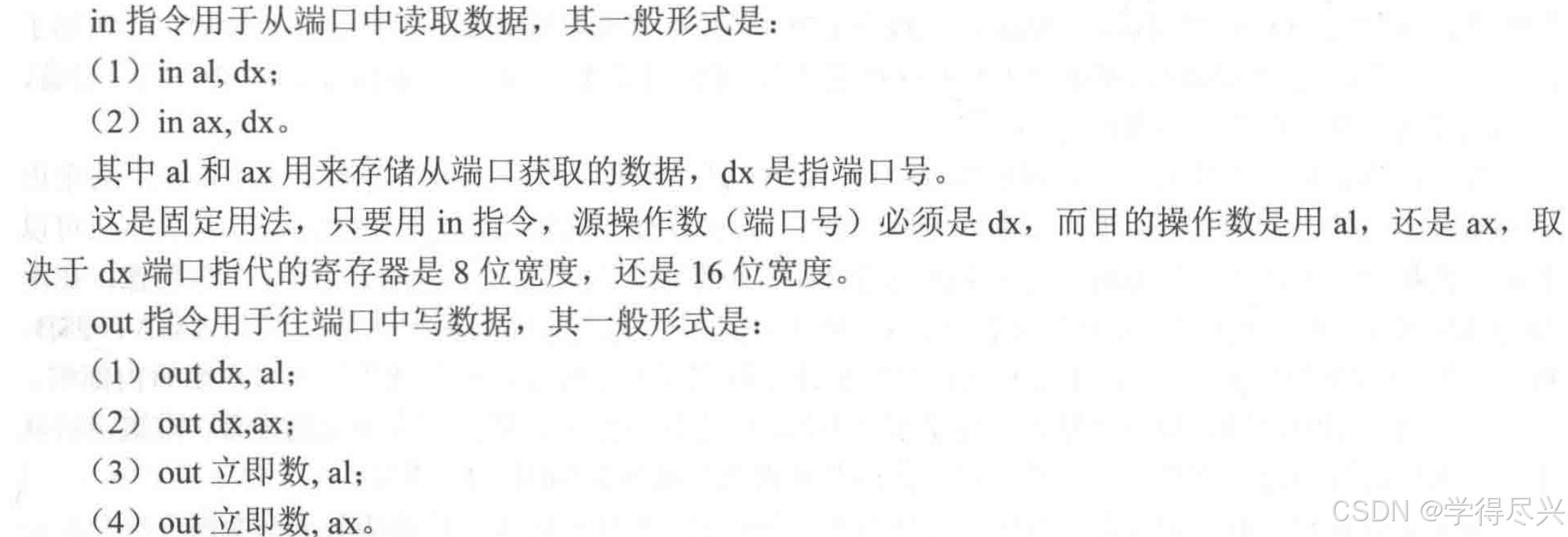 进入保护模式后,无法使用实模式下的BIOS中断的磁盘读取服务。由于读取的磁盘数据会放在1MB以上的内存区域,所以也不便于在进入保护模式前使用BIOS的磁盘读取服务来读取。在保护模式下,通常通过直接与硬件通信或者使用操作系统提供的接口来读取磁盘,loader要加载操作系统内核,就必须要和磁盘打交道。打交道的方式很简单,就是通过in 与out指令与磁盘暴露在外的寄存器交互。下图是in与out指令的用法:
