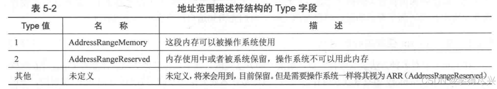 此结构中的字段大小都是4字节,共5个字段,所以此结构大小为20字节。每次int 0x15之后,BIOS就返回这样一个结构的数据。注意,ARDS结构中用64位宽度的属性来描述这段内存基地址(起始地址)及其长度,所以表中的基地址和长度都分为低32位和高32位两部分。其中的Type字段用来描述这段内存的类型,这里所谓的类型是说明这段内存的用途,即其是可以被操作系统使用,还是保留起来不能用。Type字段的具体意义见表5-2。