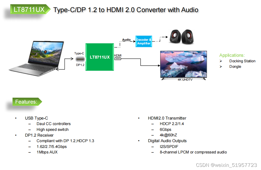 LT8711UXC是/D4/2Lane 的Type-C/DP到HDMI2.0转换器芯片