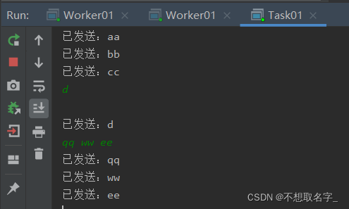 启动两个工作线程(即消费者),一个消息发送线程演示。