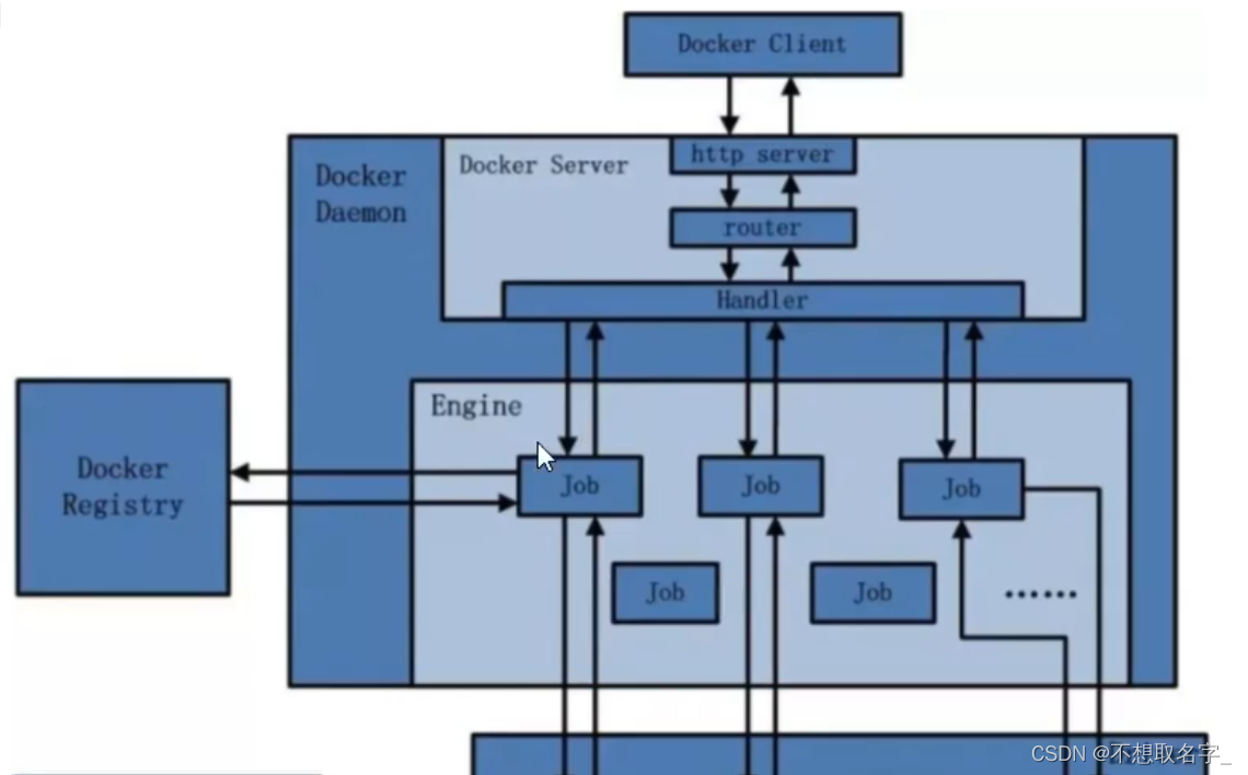 Docker是一个C/S模式的架构,后端是一个松耦合架构,众多模块各司其职。