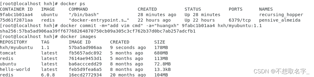 docker commit -m="提交的描述信息" -a="作者" 容器ID 要创建的目标镜像名:[标签名]