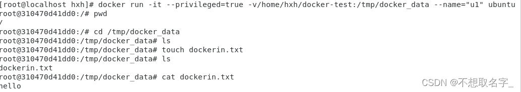 命令:docker run -it --privileged=true -v /宿主机绝对路径目录:/容器内目录 镜像名