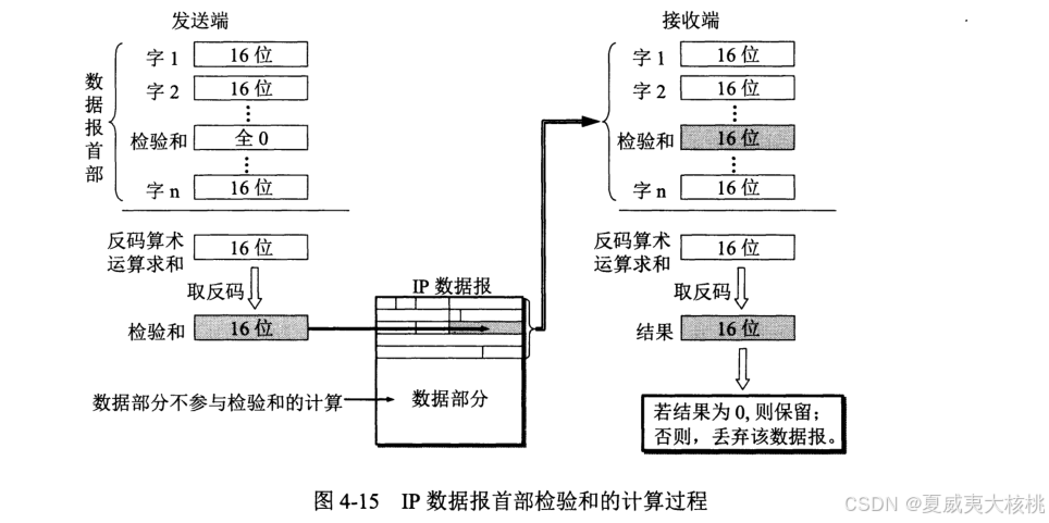 这里带来的好处就是,当我们收到一个报文时,虽然大端机器和小端机器取出 16 位数据的方式是不一样的,但是字节序可换的性质保证了计算结果并不会影响到,校验时得到的结果是否全是 1, 或者取反全是 0。