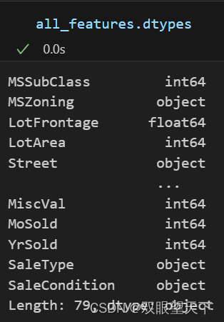 numeric_features = all_features.dtypes[all_features.dtypes != ‘object‘].index; 然后all_features.dtypes!= ‘object’,为判断各列数据是否不为object对象。不为则返回True,是则返回False。= ‘object’]把数据类型不为object的各列取出来。即The data type of each column。all_features.dtypes是获得每一列数据的类型进行返回。在学习沐神的动手学深度学习中,遇到如下语句不懂。