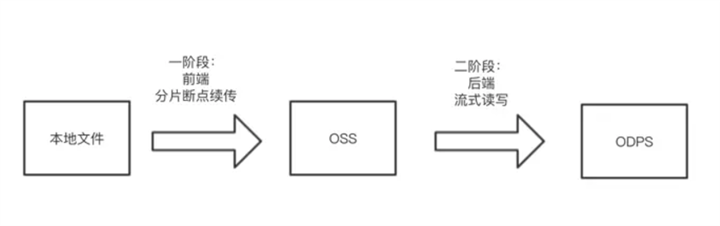 文件从本地到ODPS可以分为两个阶段,第一阶段前端分片断点续传将本地文件上传至OSS,第二阶段后端流式读写将数据从OSS同步至ODPS,如下图所示: