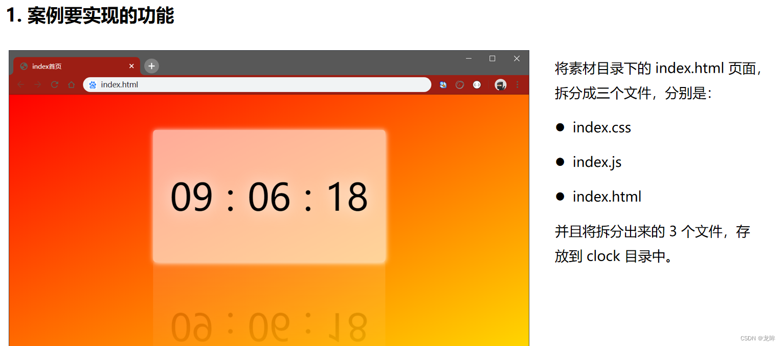黑马案例--实现 clock 时钟的web服务器 把文件的实际存放路径,作为每个资源的请求url地址。③将资源的请求url地址映射为文件的存放路径。②创建基本的web服务器。④读取文件内容并响应给客户端。步骤5优化资源的请求路径。⑤优化资源的请求路径。...