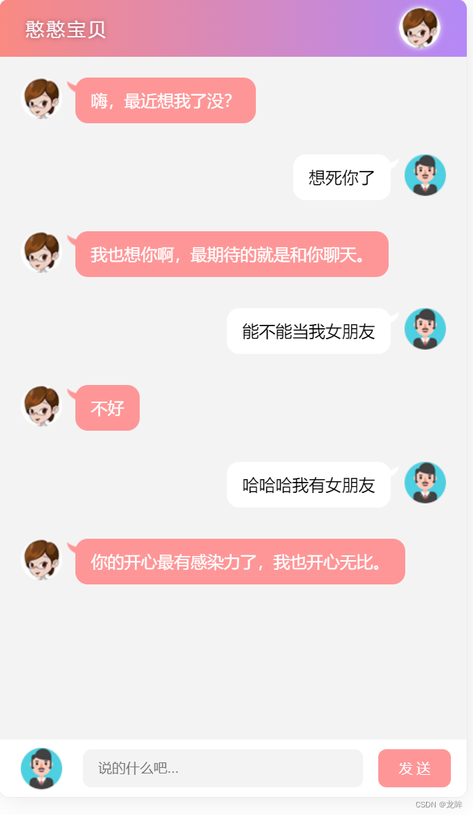聊天机器人(Ajax实现聊天机器人接口的调用) 文章目录前言一、UI布局二、用户内容渲染到聊天窗口三、获取聊天机器人消息1.jquery中的ajax2.调用机器人接口四、将机器人的聊天内容转化为语音播放五、使用回车发送消息总结————————————————————————————————————————————————前言本文介绍如何用ajax调用聊天机器人接口,将信息显示到聊天框中,语音播放机器人消息。聊天框分为头部Header、中间聊天区域、底部Footer消息编辑三大部分。在聊天区域,每条信息都放到每个li中,机器人消息