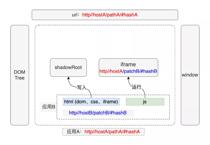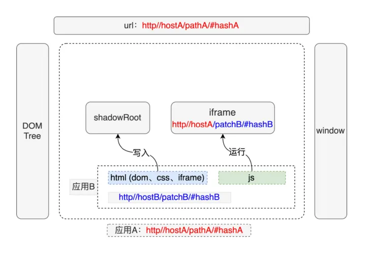在应用A中构造一个shadow和iframe,然后将应用B的html写入shadow中,js运行在iframe中,注意iframe的url,iframe保持和主应用同域但是保留子应用的路径信息,这样子应用的js可以运行在iframe的location和history中保持路由正确。