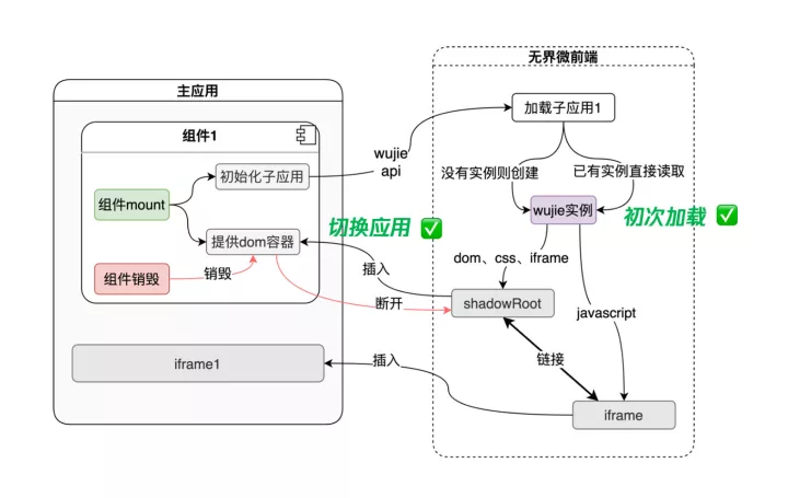 wujie实例可以提前实例化,包括shadowRoot、iframe的创建、js的执行,这样极大的加快子应用第一次打开的时间 - ✅ 切换白屏的问题,一旦