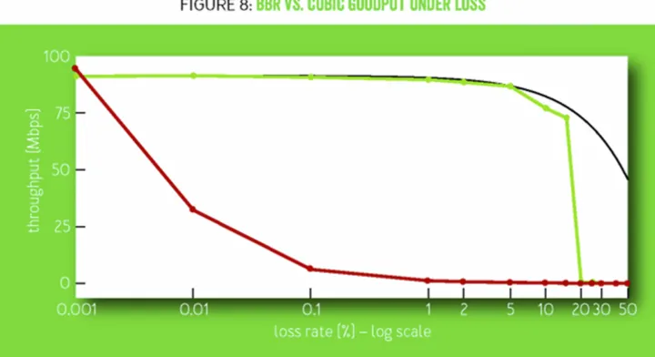 下图展示了在一条 100Mbps,100ms 的链路上,BBR 和 CUBIC 在 60 秒内的吞吐量与随机丢包率(从 0.001%~50%)的关系。在丢包率只有 0.1%的时候,CUBIC 的吞吐量就已经下降了 10 倍,并且在丢包率为 1%的时候就几乎炸了。而理论上的最大吞吐量是链路速率乘以(1-丢包率)。BBR 在丢包率为 5%以下时还能基本维持在最大吞吐量附近,在 15%丢包率的时候虽然有所下降但还是不错。