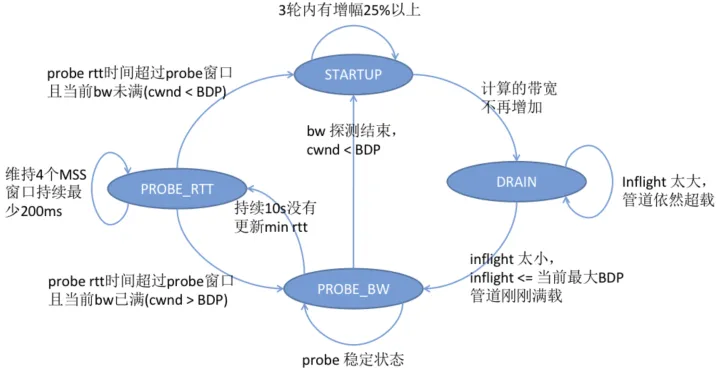 BBR 算法也是基于状态机。状态机有STARTUP、DRAIN、PROBE_BW、PROBE_RTT四种状态。不同状态下 pacing_gain 和 cwnd_gain 的取值会有所不同。