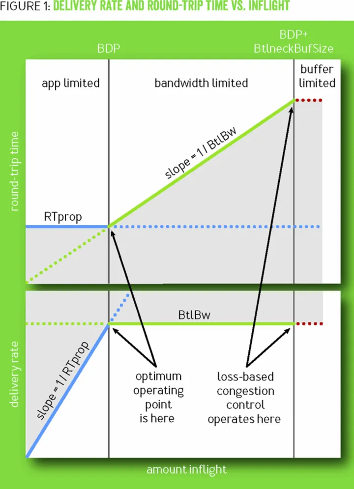 如下图所示,当没有足够的数据来填满管道时,RTprop 决定了流的行为;当有足够的数据填满时,那就变成了 BtlBw 来决定。这两条约束交汇在点 inflight =BtlBw*RTprop,也就是管道的 BDP(带宽与时延的乘积)。当管道被填满时,那些超过的部分(inflight-BDP)就会在瓶颈链路中制造了一个队列,从而导致了 RTT 的增大。当数据继续增加直到填满了缓存时,多余的报文就会被丢弃了。拥塞就是发生在 BDP 点的右边,而拥塞控制算法就是来控制流的平均工作点离 BDP 点有多远。