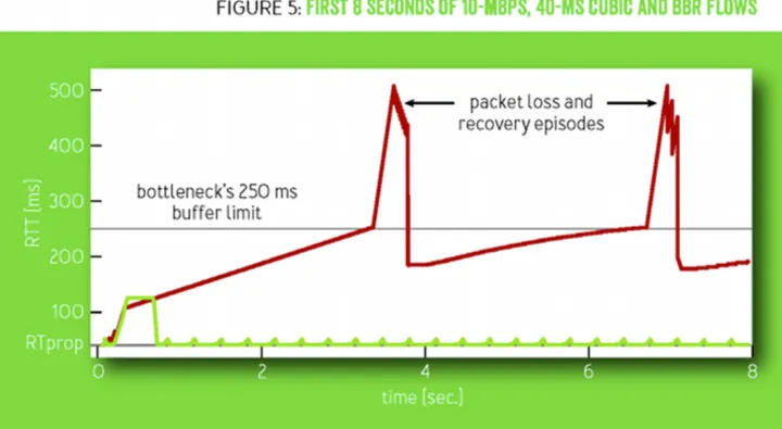 基于丢包的拥塞控制算法工作在 bandwidth-limited 区域的右边界区域,尽管这种算法可以达到最大的传输速率,但是它是以高延迟和高丢包率作为代价的。在存储介质较为小的时候,缓存大小只比 BDP 大一点,此时这种算法的时延并不会很高。然而,当存储介质变得便宜之后,交换机的缓存大小已经是 ISP 链路 BDP 的很多很多倍了,这导致了 bufferbloat,从而导致了 RTT 从毫秒级升到了秒级。