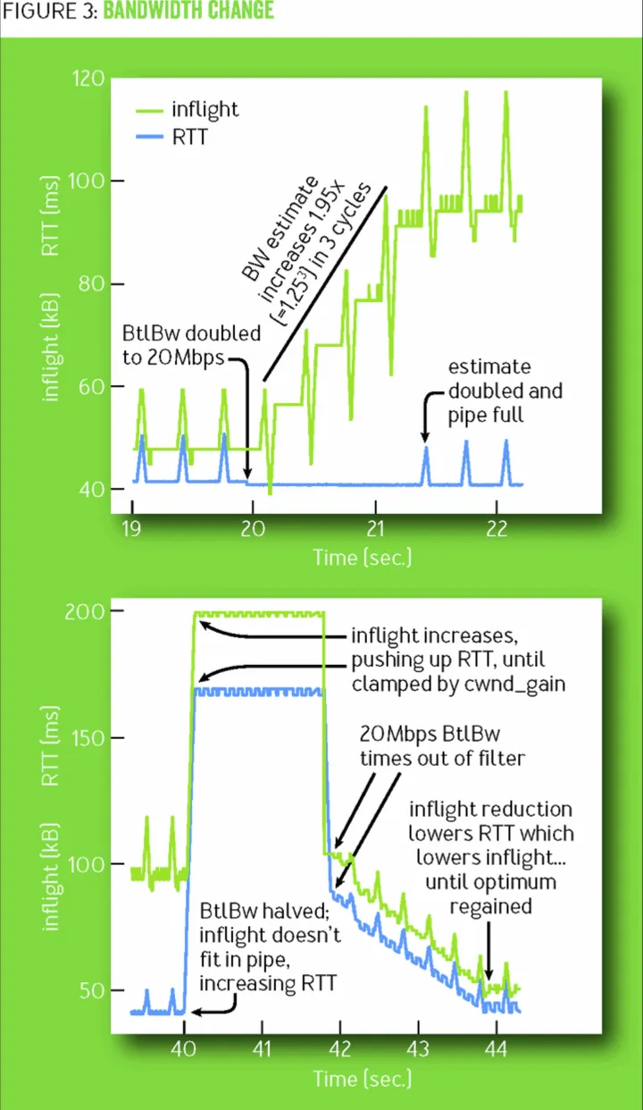 bottleneck bandwidth 的估计不像 RTT 那样方便,没有一种 TCPspec 要求实现算法来跟踪估计 bottleneck 带宽,但是,可以通过跟踪发送速率来估计 bottleneck 带宽。当发送方收到一个 ACK 报文时,它可以计算出该报文的 RTT,并且从发出报文到收到 ack 报文这段时间的 data Inflight。这段时间内的平均发送速率就可以以此计算出来: