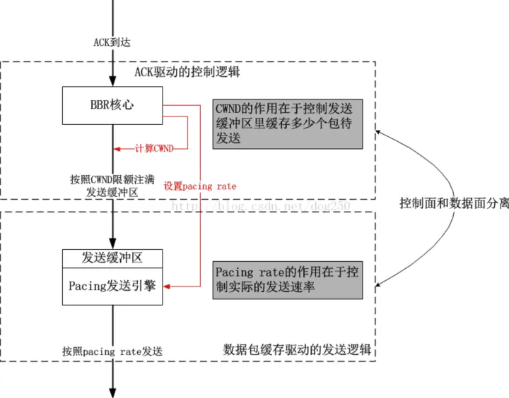 bbr 算法输出 pacing_rate 和 cwnd 两个数据。pacing_rate 决定发包速率,cwnd 为窗口大小。每一次 ACK 都会根据当前的模式计算 pacing_rate 和 cwnd。注意在计算 pacing_rate 和 cwnd 时有 pacing_gain 和 cwnd_gain 两个参数,