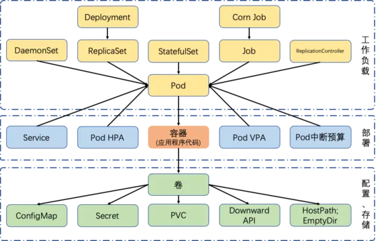 K8s的核心概念以及之间的关系。这里的概念都是给用户来操作、管理K8s中的对象所使用的。在K8s的使用过程中是理解这些概念并了解作用原理。