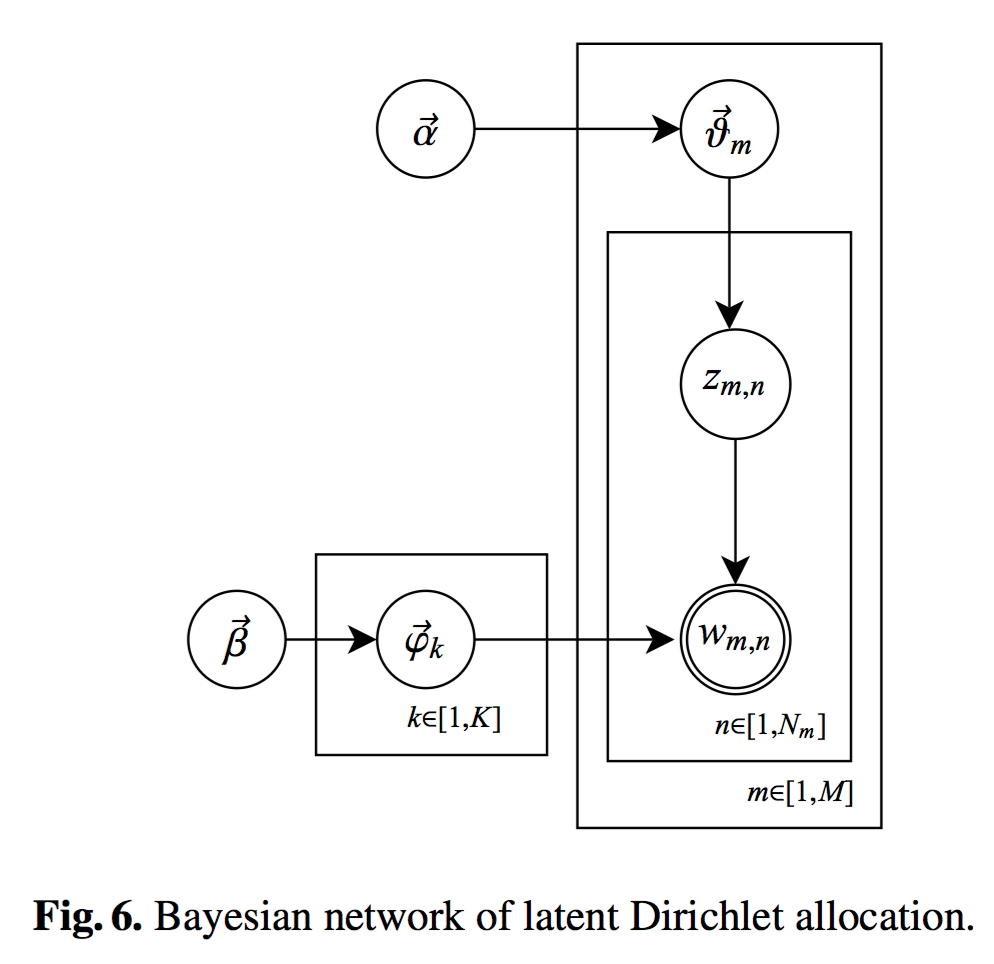 其中 θ ⃗ m 与 ϕ ⃗ k \vec{\theta}_m与\vec{\phi}_k θm与ϕk是模型去估计总体的参数,而 α ⃗ 与 β ⃗ \vec{\alpha}与\vec{\beta} α与β是这些待估参数的先验分布,通过最大后验概率来估计总体参数…