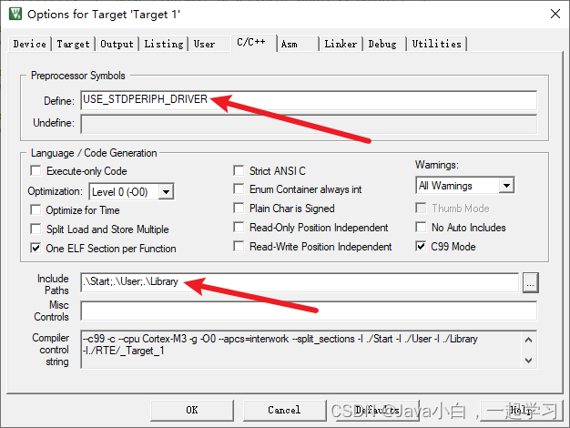 - 工程选项,C/C++,Define内定义USE_STDPERIPH_DRIVER