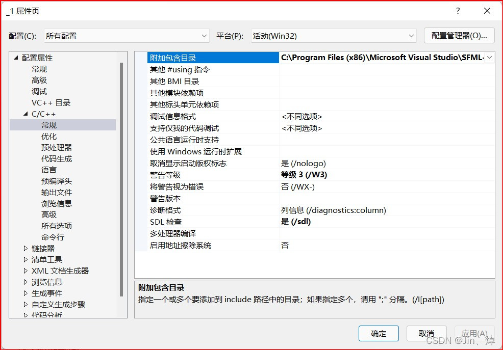 No_4,右键项目属性,C++常规,左上角配置选择所有配置——>附加包含目录,点编辑,添加你的sfml中的include路径(就是告诉编译器在哪里可以找到 SFML 头(.hpp 文件))