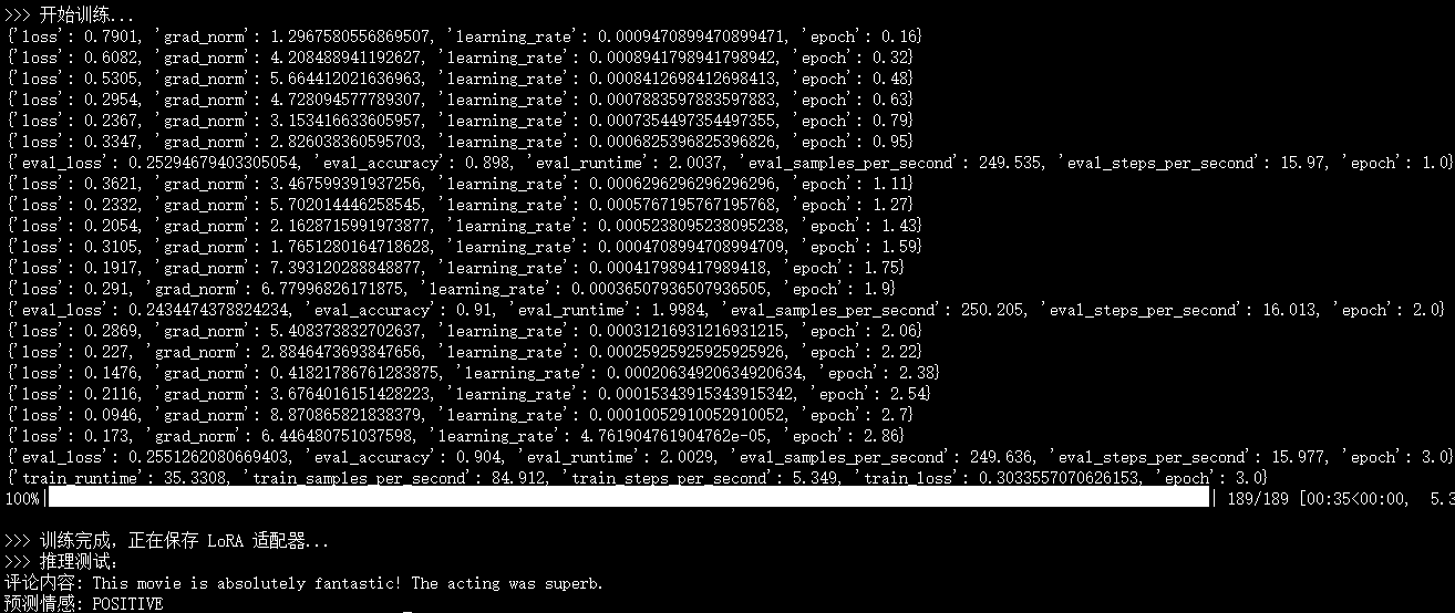 这就是 LoRA 的核心魅力:我们仅仅训练了原本 0.2% 的参数量,就让模型学会了分辨电影评论的情感。