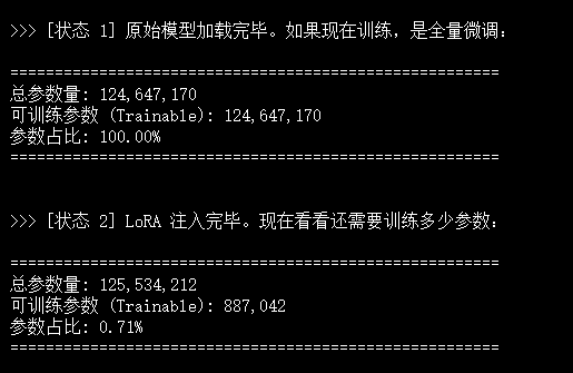 print("\n>>> [状态 1] 原始模型加载完毕。如果现在训练,是全量微调:")