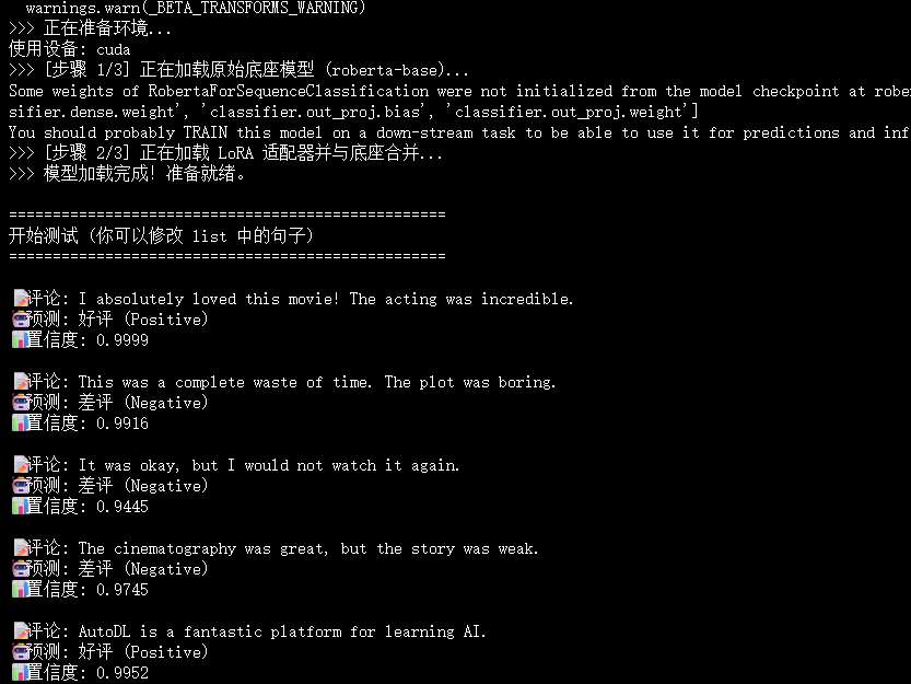 使用经典的 RoBERTa 模型 (比较小)进行一个 情感分析任务(判断评论是好评还是差评)。可以在 AutoDL https://www.autodl.com/的最基础显卡(如 RTX 3090 甚至 2080Ti)上轻松运行,全流程大约只需 5-10 分钟。