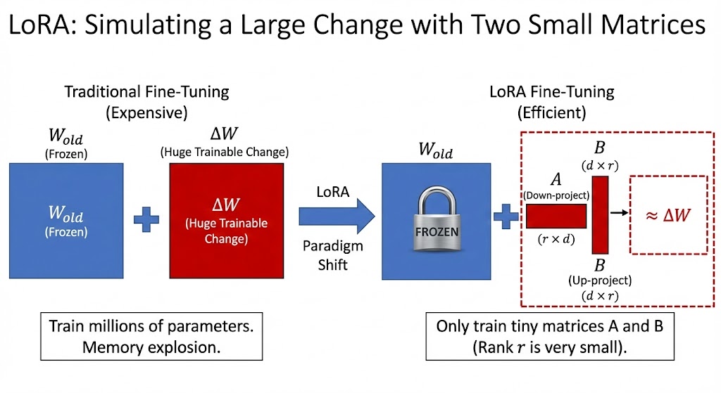 基于这个洞察,LoRA 的发明者想:既然所需的变化量不复杂(低内在维度),那我们为什么要用一个和原模型一样巨大的矩阵来表示这个变化呢?这是巨大的浪费。