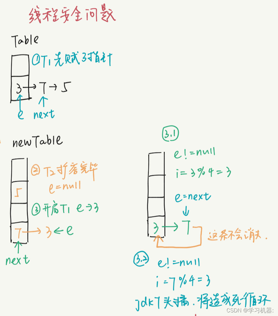 拷贝原数据采用的是头插法,在并发场景下,如果两个值在新数组中哈希冲突一样会出现环状链表的情形,最终导致死循环。如下图所示:
