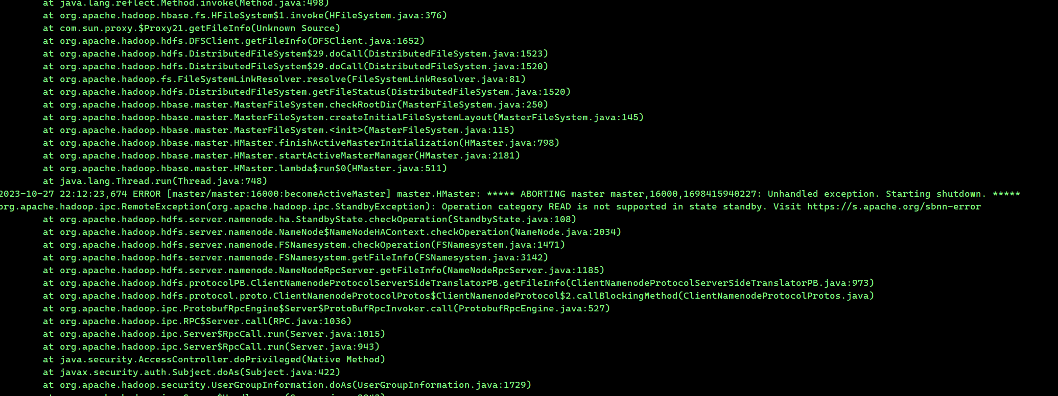 hadoopHA高可用下部署大数据组件[master/master:16000:becomeActiveMaster] master.HMaster: ***** ABORTING master master.HMaster: ***** ABORTING master master,16000,1698415940227: Unhandled exception. Starting shutdown. *****org.apache.hadoop.ipc.RemoteException(org.apache.hadoop.ipc.StandbyException): Operation category READ is not supported in state standby. Visit