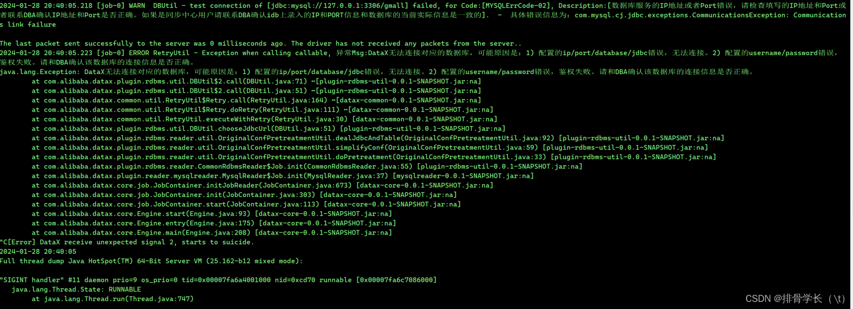 DataX运行报错:数据库服务的IP地址或者Port错误,请检查填写的IP地址和Port或者联系DBA确认IP地址和Port是否正确。如果是同步中心用户请联系DBA确认idb上录入的IP和PORT信息 第一眼看到我就马上打开了这个任务的json,检查了好几次连接串都正确,起初host我写的是hostname的,如何修改为IP,还是报错,最后改成现在报文所示的127.0.0.1,最终确定绝对不是host问题。既然不是host和port的问题。是不是因为连接串参数问题,我报错的连接串是什么参数都没有添加的,说不定因为这个,马上让我联想到了一个参数useSSL=false。会不会是因为没有禁用SSL进行连接的问题呢。最后运行果然成功了不报错了。如果有大佬有更加标准的解释或者解决方案,还望在评论区不吝赐教!