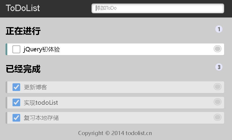 jQuery初体验 —— 本地存储方式实现ToDoList 文章目录前言一、ToDoList 案例介绍二、ToDoList 案例分析1.本地存储数据2.页面渲染三、案例实现总结前言终于学到jQuery啦!今天通过实现ToDoList这个小案例来练习一下jQuery的使用,顺便复习一下本地存储。(源码在文末)一、ToDoList 案例介绍文本框里面输入内容,按下回车,就可以生成待办事项。点击待办事项复选框,就可以把当前数据添加到已完成事项里面。点击已完成事项复选框,就可以把当前数据添加到待办事项里面。本页面内容刷新页面不会丢失。最终效果如下图所