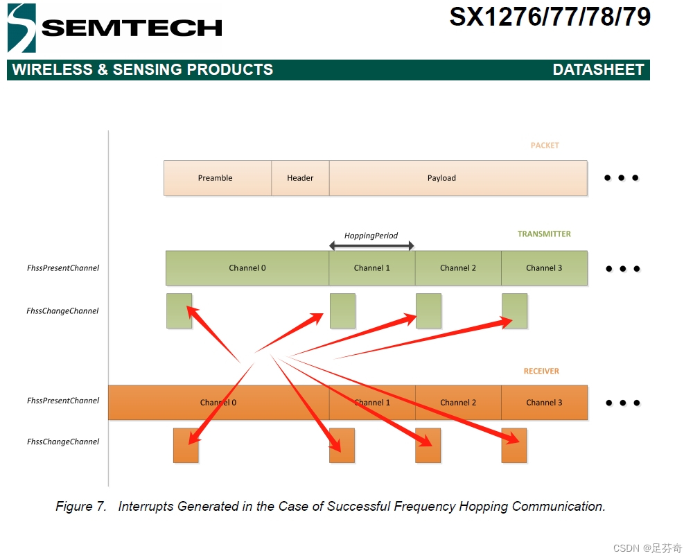 在图中,可以看到箭头所指为FHSS中断,故在每个信道开始前产生而不是在信道结束的时候产生,这是较为重要的一点。收发双方的0X24中信道停留时间即hoppingperiod此处保证了双方的时序同步。信道0中放的是前导码和同步字。