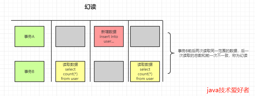 事务B前后两次读取同一个范围的数据,在事务B两次读取的过程中事务A新增了数据,导致事务B后一次读取到前一次查询没有看到的行。