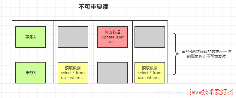 事务B读取了两次数据资源,在这两次读取的过程中事务A修改了数据,导致事务B在这两次读取出来的数据不一致。